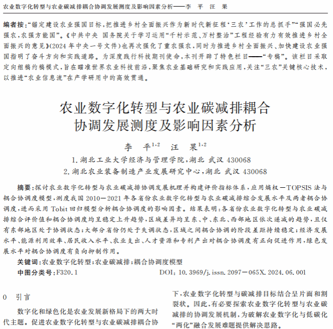 9月14日,2025年湖北科技期刊高质量发展论坛在武汉举办,这是2025年湖北科学技术学术年会的重要活动之一。会上推介了2024年度湖北省科技期刊优秀论文,其中发表在我校《数字农业与智能农机》的学术论文《农业数字化转型与农业碳减排耦合协调发展测度及影响因素分析》(作者:李平,汪果;单位:湖北工业大学经济与管理学院)成功入选。