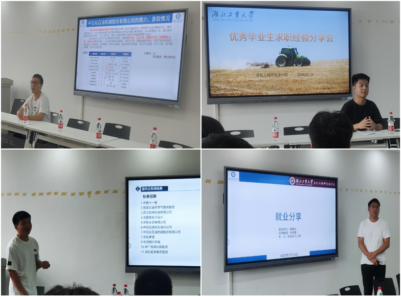 为引导农机院硕士研究生提早做好职业规划,进一步明确就业方向,5月26日下午,农机院研究生办公室邀请我校机械学院四位优秀毕业生杨文广、周越、申平枫、韩新光进行了求职经验分享,农机院研一、研二共50名研究生参加了分享会。农机院副院长胡新宇出席会议并讲话。