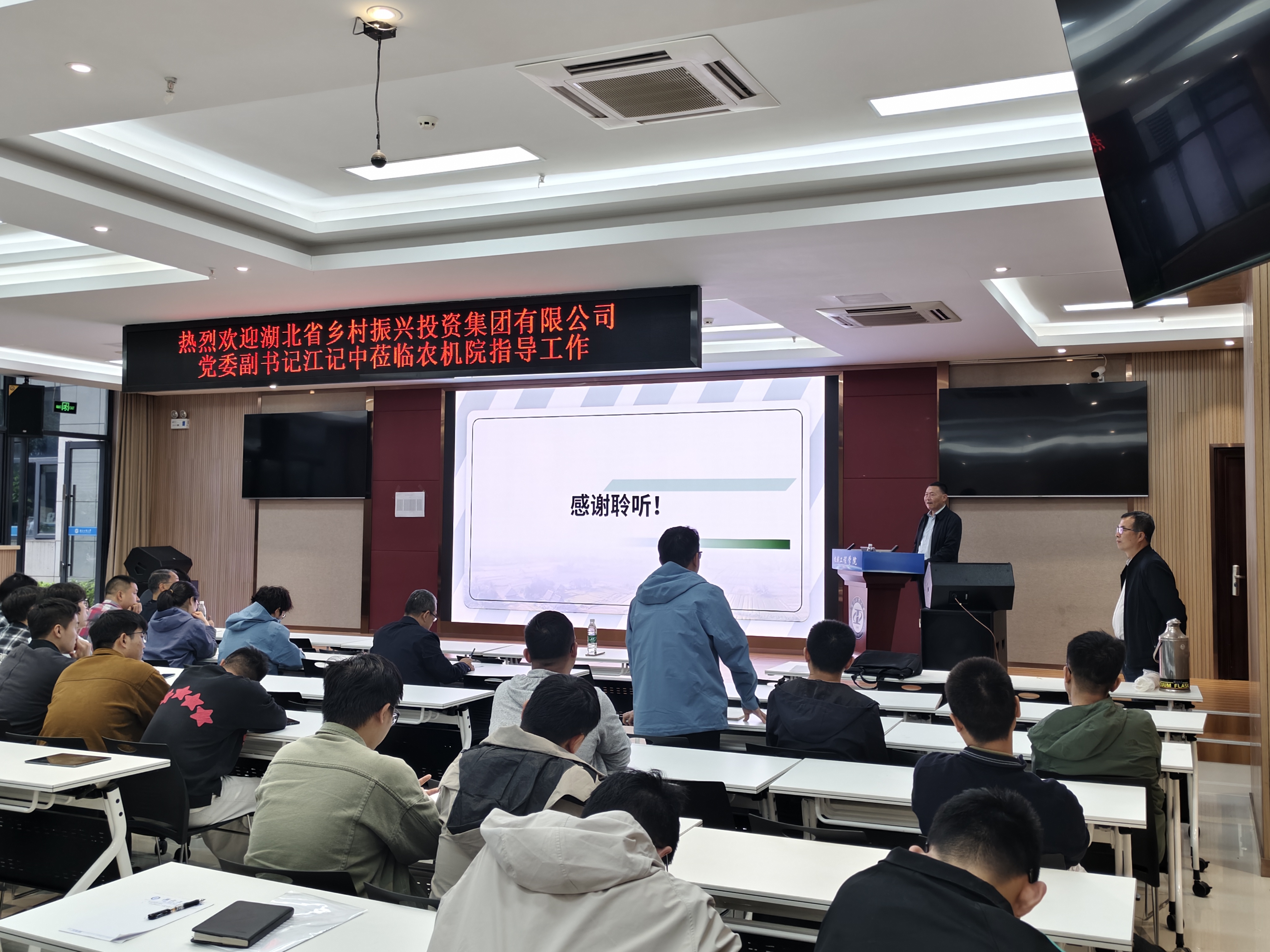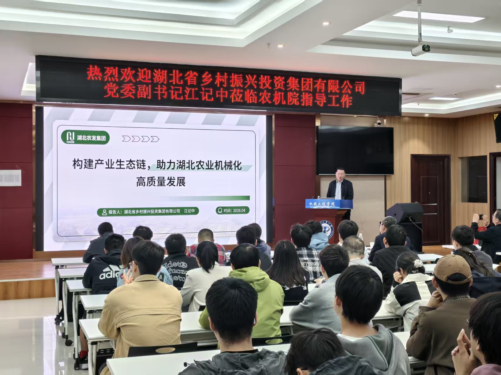 4 月 21 日下午,湖北省乡村振兴投资集团有限公司党委副书记江记中应邀莅临我院,作题为《构建产业生态链,助力湖北农机机械化高质量发展》的专题学术报告。报告会由院长张道德主持,全院师生代表100余人参会学习交流。